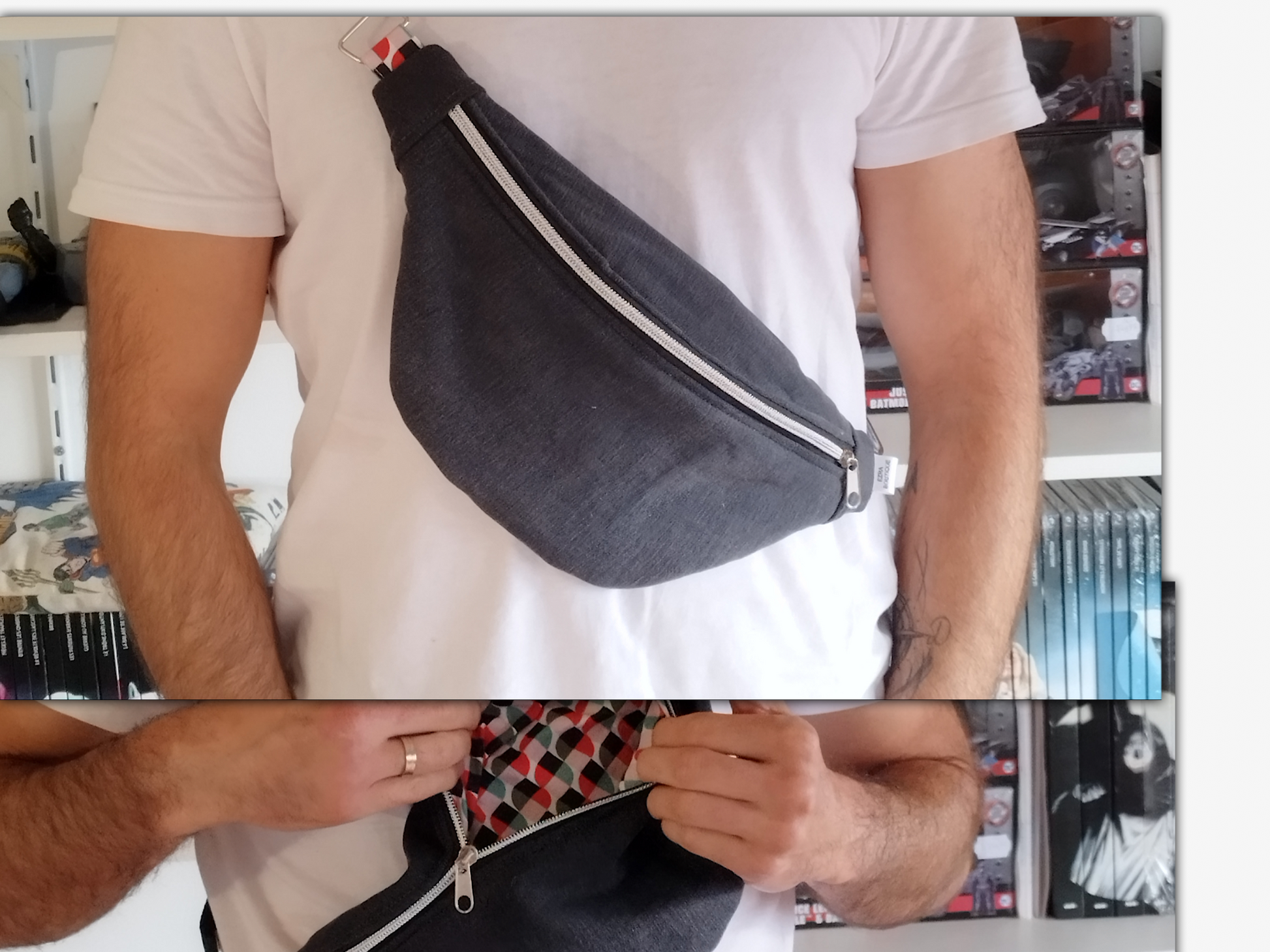 L'extérieur de cette banane est cousue dans un tissu jean , et elle est doublée soit d'une cotonnade fleurie.